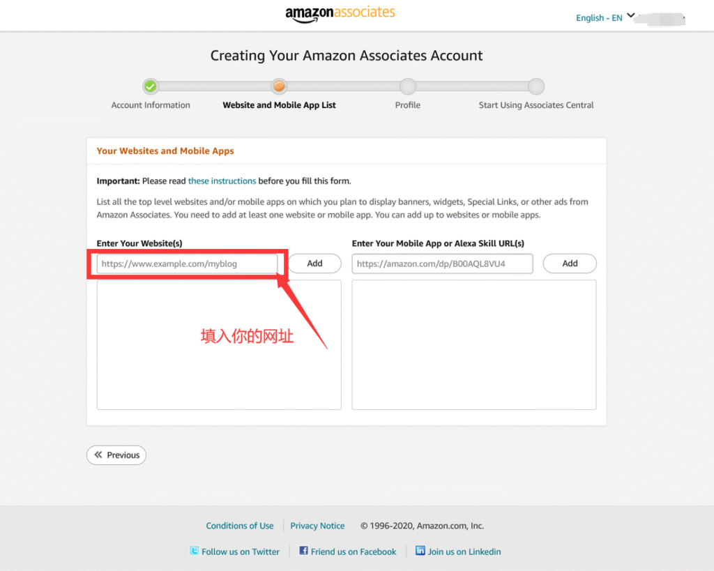 第三步,填写你的Amazon 推广ID,这个ID可以是字母和数字的组合,作为平台给你的推广链接的一部分。举例:xiaoming888可以是一个推广ID,具体看平台是否允许,是否已经占用等。
