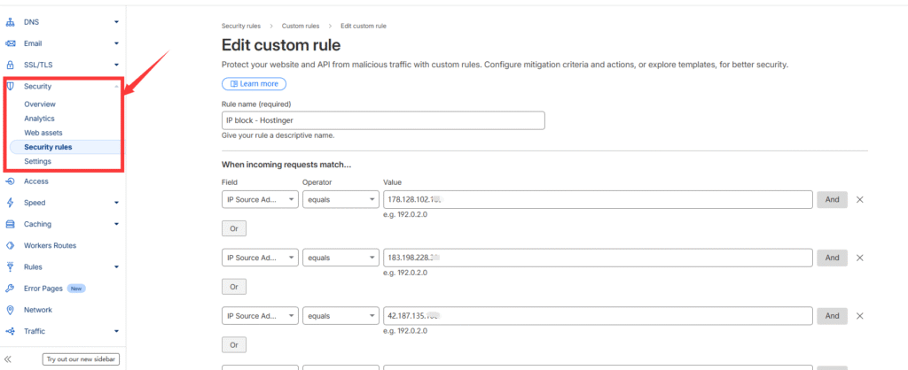 第五步,Cloudflare设置成功以后,需要设置一个屏蔽IP的规则。点击左边栏Security, 创建一个屏蔽IP的Rule(规则)。需要屏蔽的IP可以在Hostinger的后台找到。