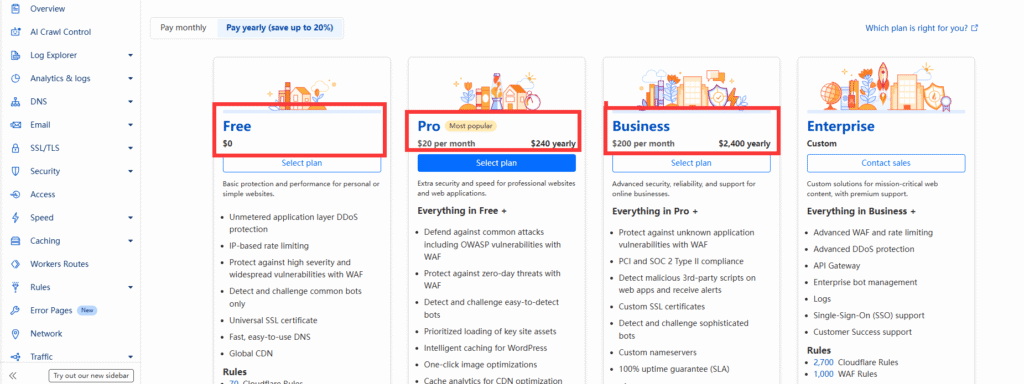 免费套餐,会有基础的功能; 某些功能受限。Pro 套餐和Business 套餐适合有不错流量的网站; Enterprise是定制套餐,价格和方案定制,估计大多数个人站长用不到。付费套餐,可月付,可年付。