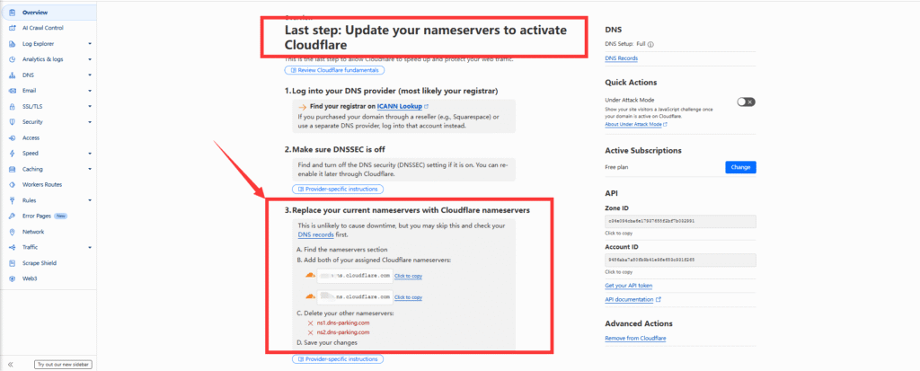 如图:Update your nameservers to activate Cloudflare. 唯有修改DNS以后才会激活Cloudflare与你的网站之间的连接。