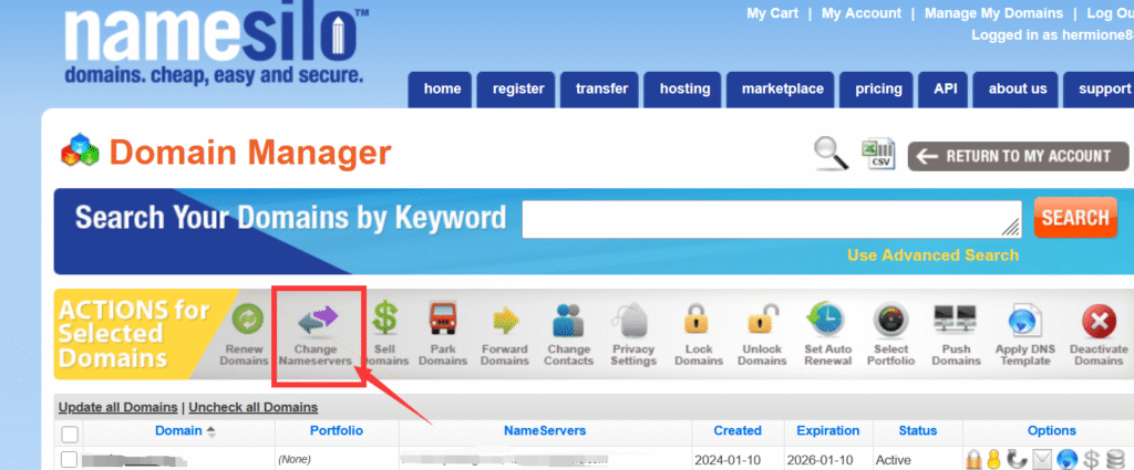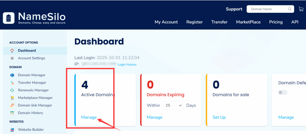 第四步,在域名服务商出修改DNS。我用的是Namesilo, 需要登录到Namesilo后台,点击右上角My Account, 在Active Domain 的位置点击Manage.