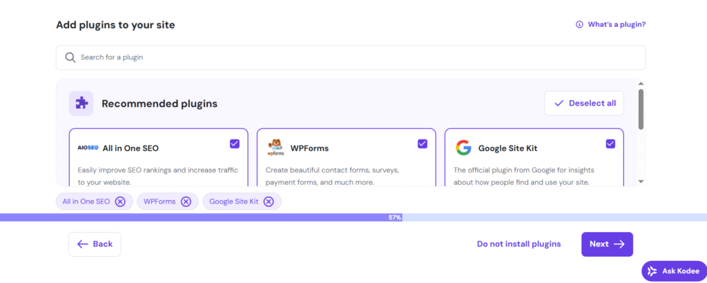 点击下一步,选择网站插件,这一步也可以不用选择安装插件。插件可以后期增加或者删除。