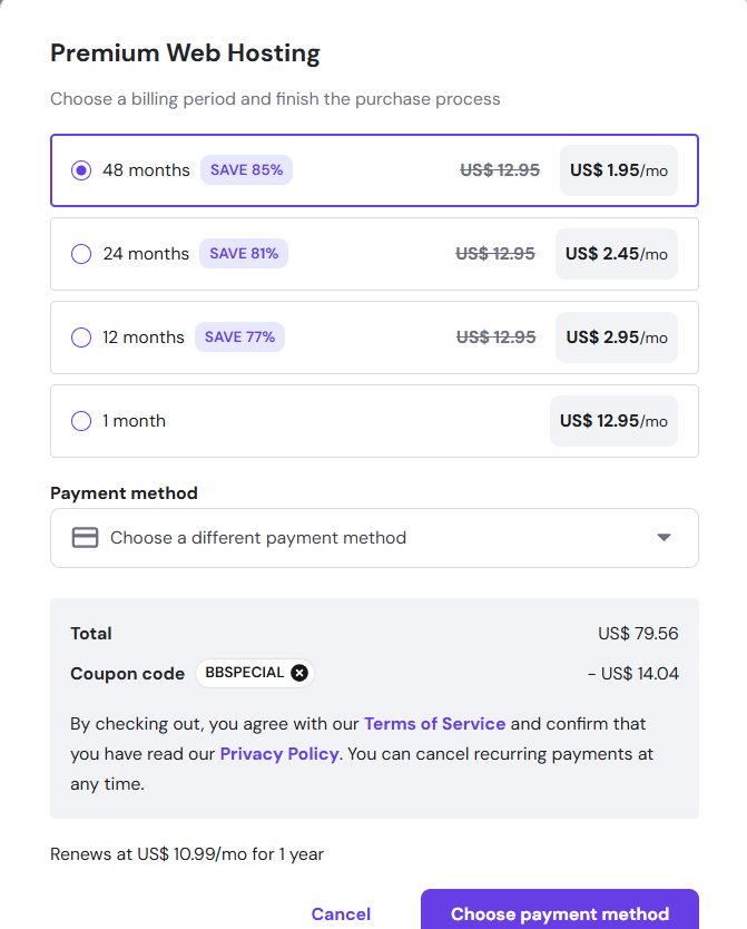 2025年11月24日(黑五促销期间,4年套餐,premium web hosting, 总价算下来才79.56美金。这个是在后台结算的实际价格。)平均每年的价格不到20美金(大概150元一年),这个应该是最低价格了。总的来说,黑五期间买Hostinger是最最最优惠的。