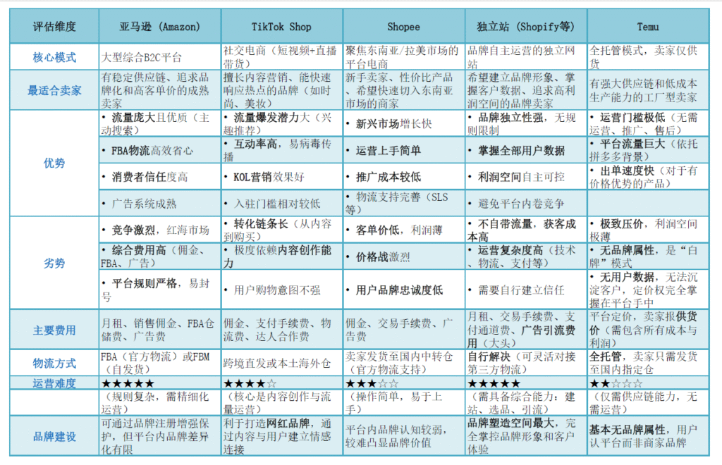 以下这张表格详细总结了亚马逊,Tiktok Shop, Shopee, 独立站(Shopify等), Temu平台的优势和劣势,供各位跨境小伙伴参考: